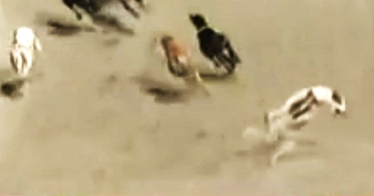 The image shows Rogue Choice falling after a collision and suffering a fractured leg. Just a pup at 23 months of age, Rogue Choice was killed by the on-track industry vet. The race video has not been uploaded.