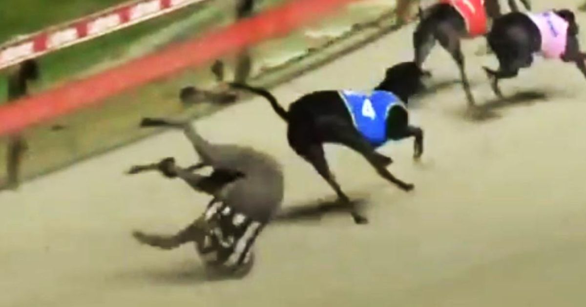 The image shows two-year-old Knighted Storm falling and suffering a broken neck at Wentworth Park on 14 November. He was killed by the industry vet after the race.