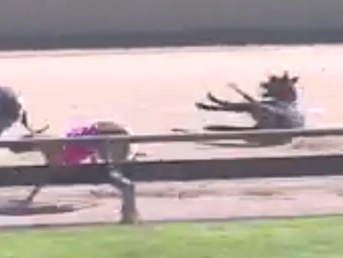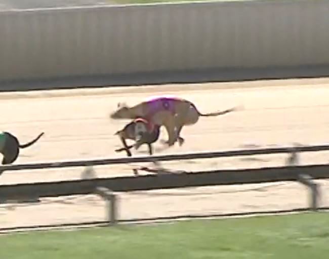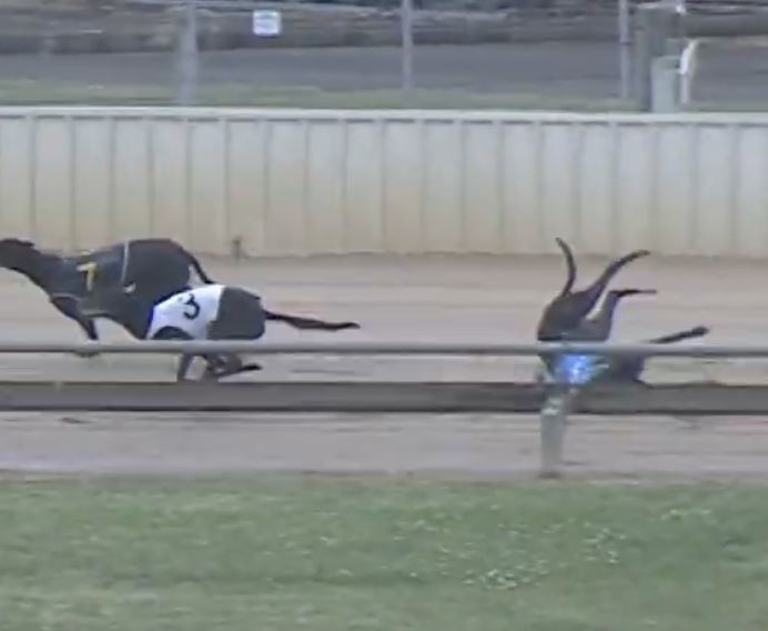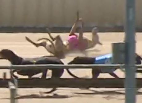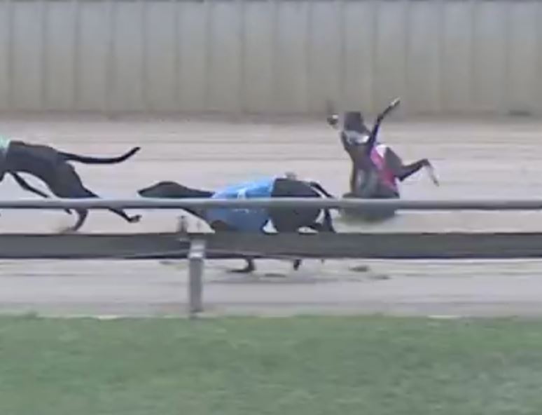 Image at top shows Blinkin’ Blue’s fatal fall at Warrnambool. Images below show other scenes from the track; many of these dogs were killed.