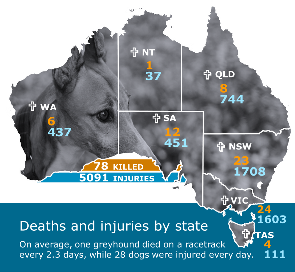 The statistics below cover a wide range. On average, one greyhound was killed while racing every 2.3 days, while 28 dogs were hurt every day.