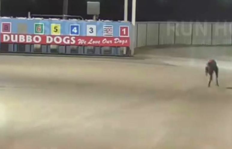 Under the sign saying “We love our dogs”, ten greyhounds suffered injuries at one Dubbo race meeting held on 3 July 2021.